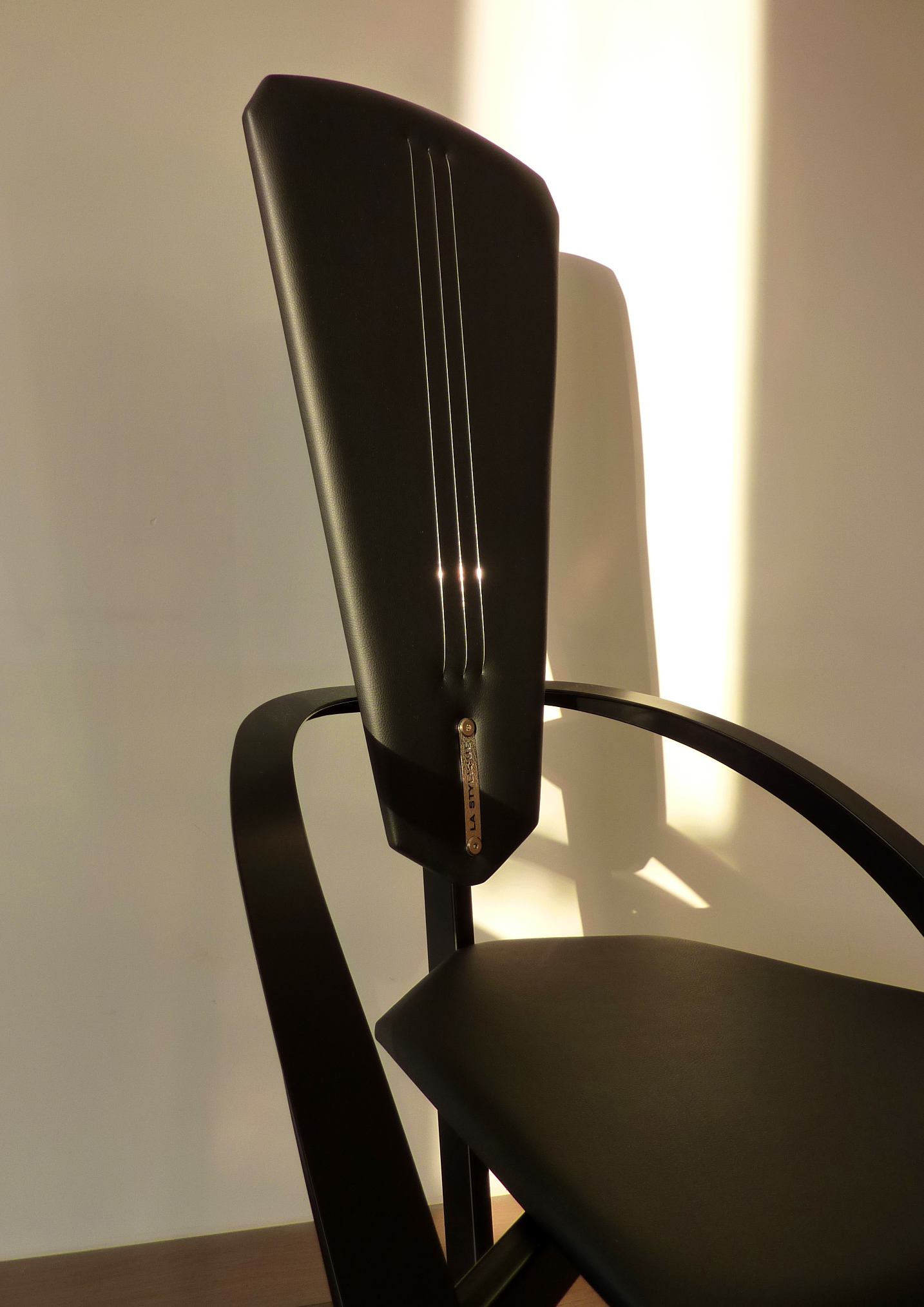Une fois les lignes définies; chaque courbe, chaque agencement entre métal et cuir allait définir une rencontre avec les meilleurs artisans pour une finition parfaite de cette chaise contemporaine.