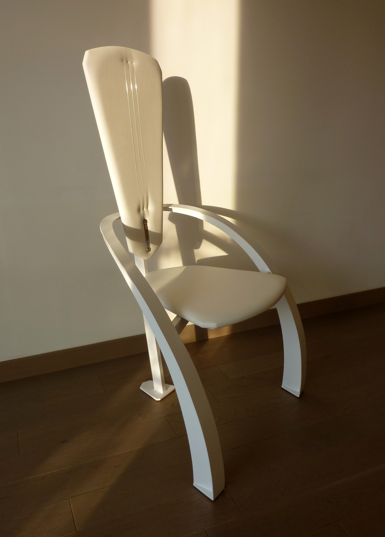 De prime abord, inspiré de l’oeuvre architecturale, le designer Jean Luc Chevallier, mis en forme l’assise dont la forme triangulaire reprend l’allure des marches en métal de l’escalier moderne.