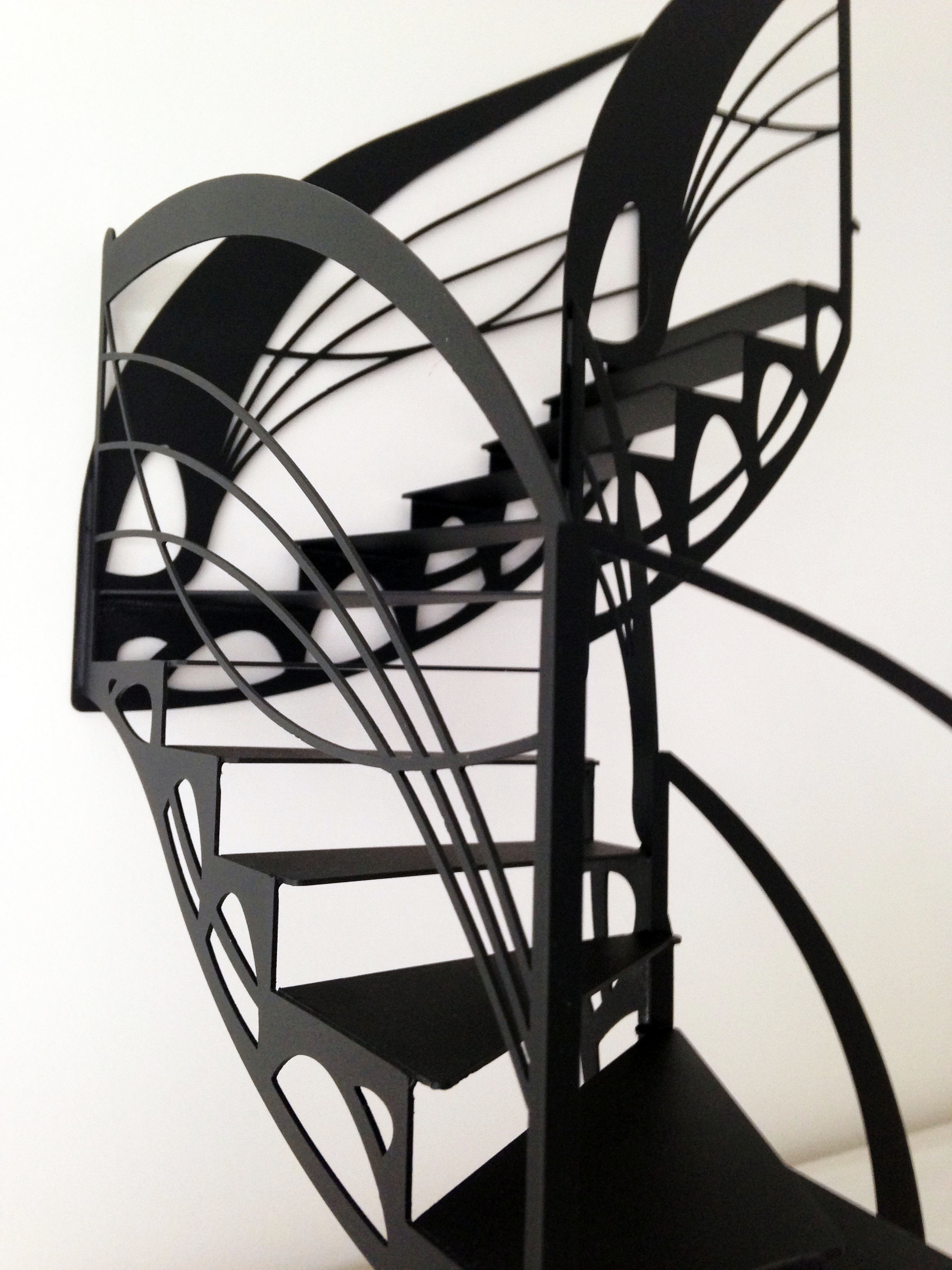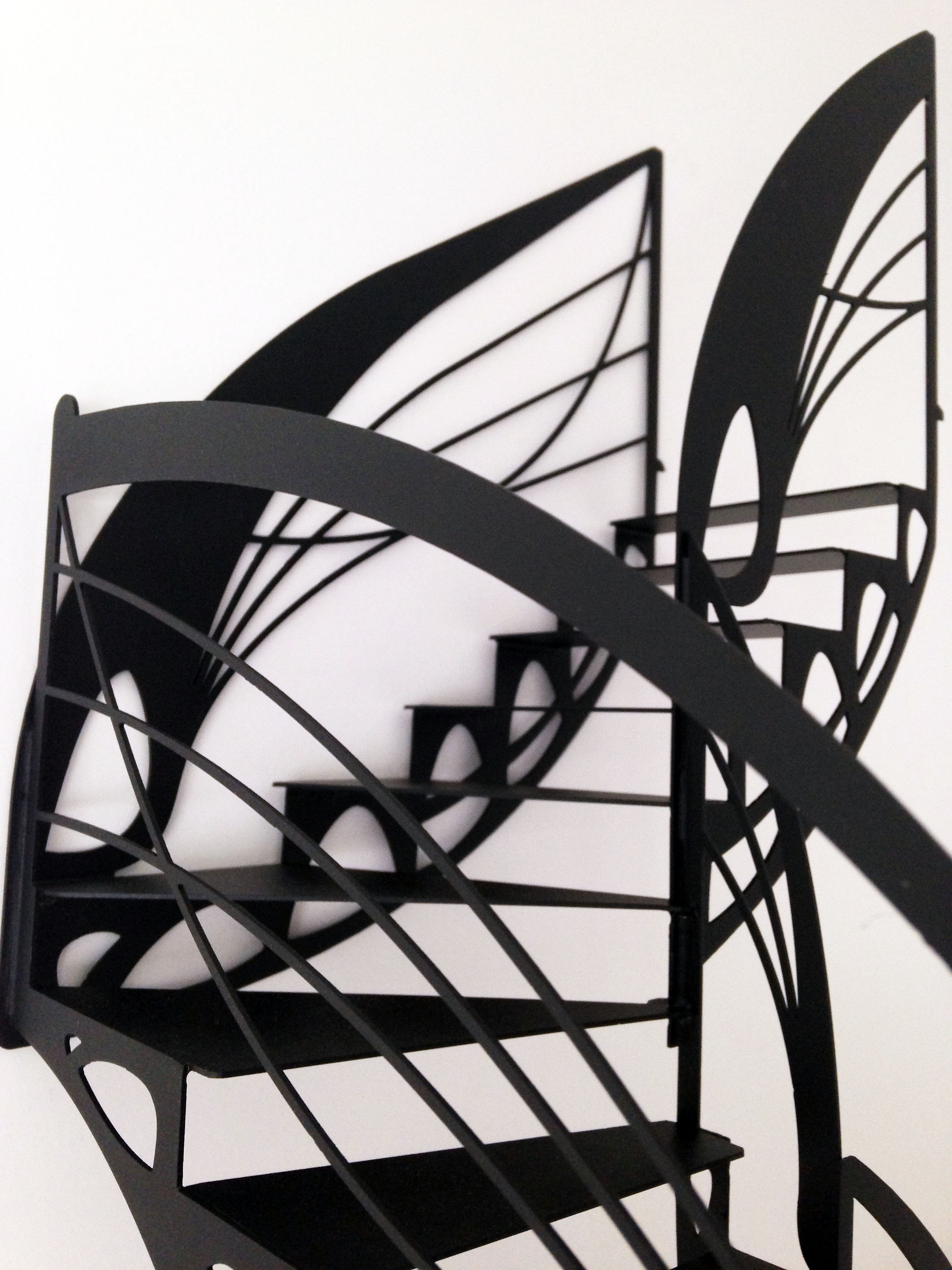 Ainsi, ce modèle d’escalier contemporain design, déclinaison du premier opus d’escalier double quart tournant dit l’escalier papillon, impose ses lignes à la fois de style Eiffel et Industriel, dont les courbes plus rondes, font une révérence au courant Art Nouveau.