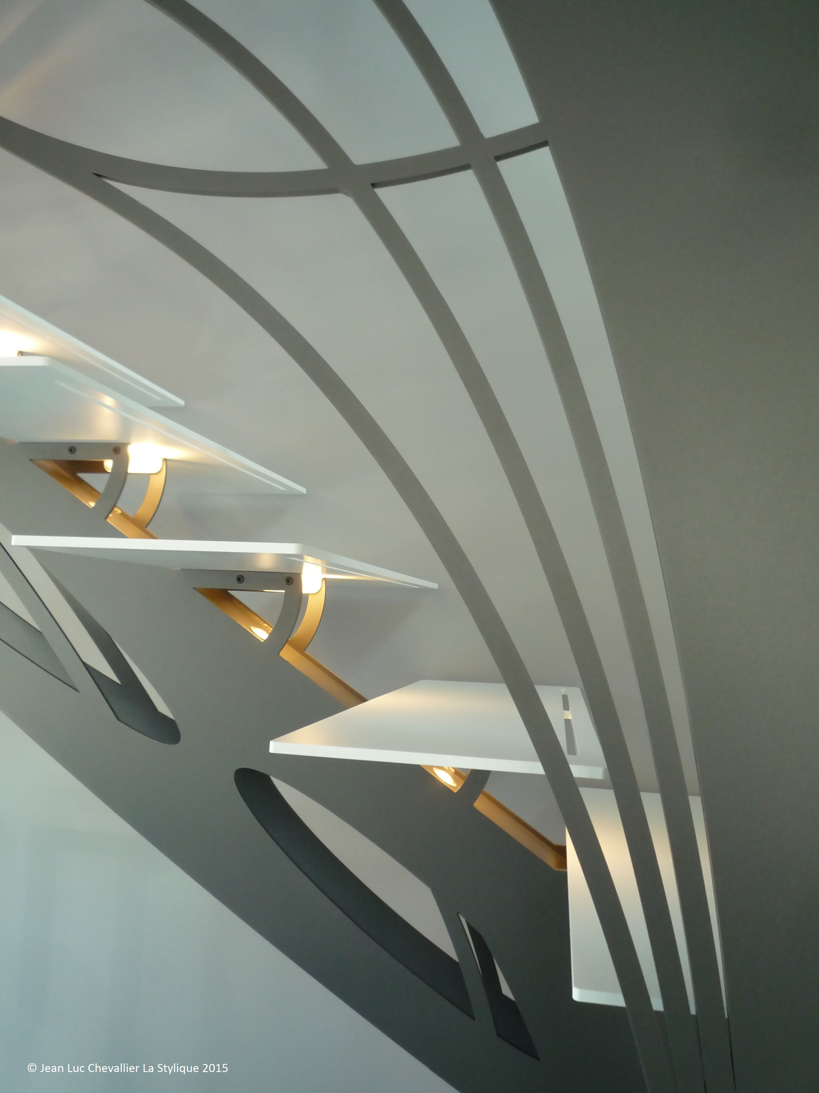 Le style unique du designer et créateur d’escalier contemporain du studio La Stylique, Jean Luc Chevallier, s’exprime au travers de ce modèle d’escalier design quart tournant dont il est à l’origine de la création.