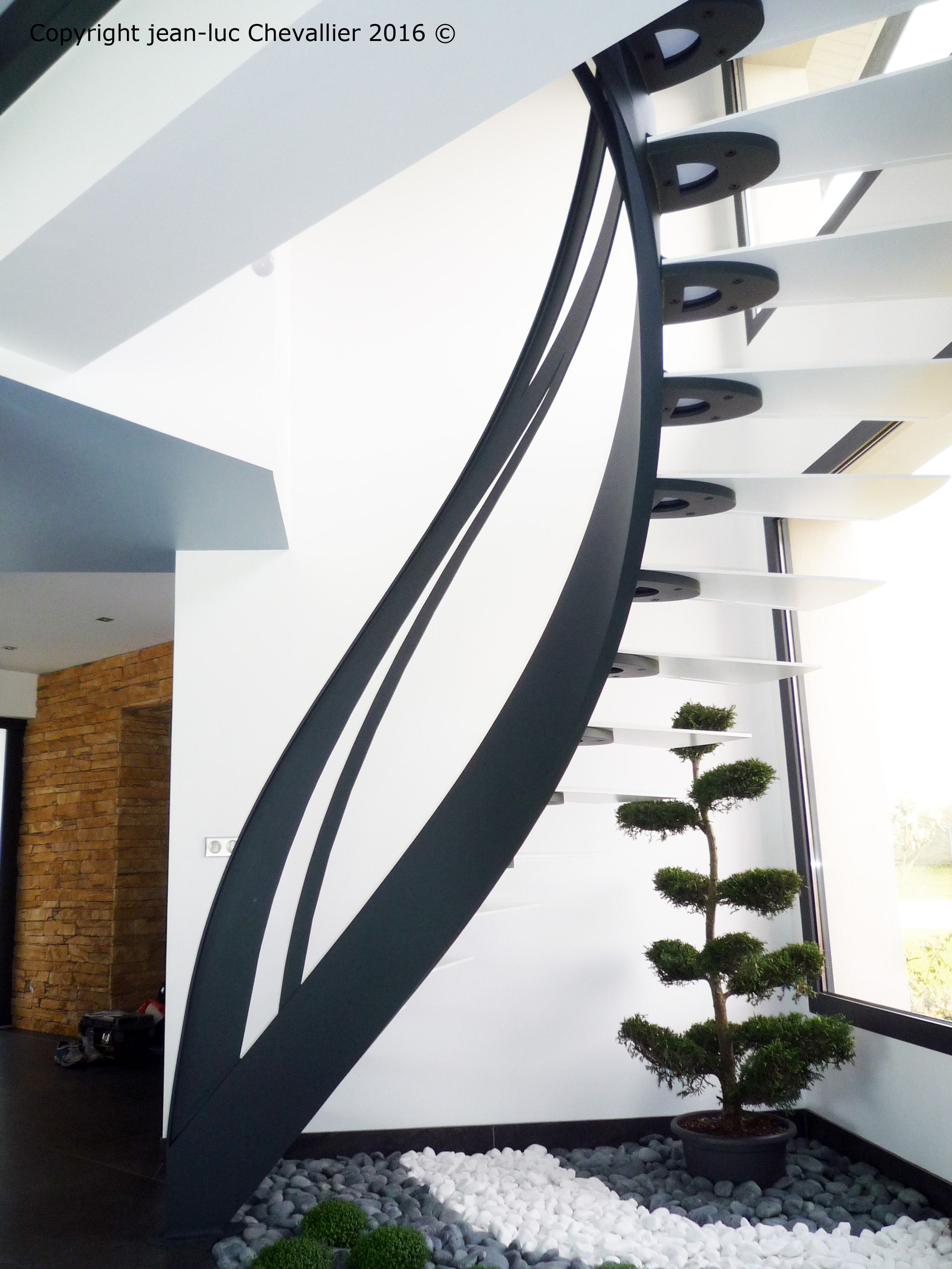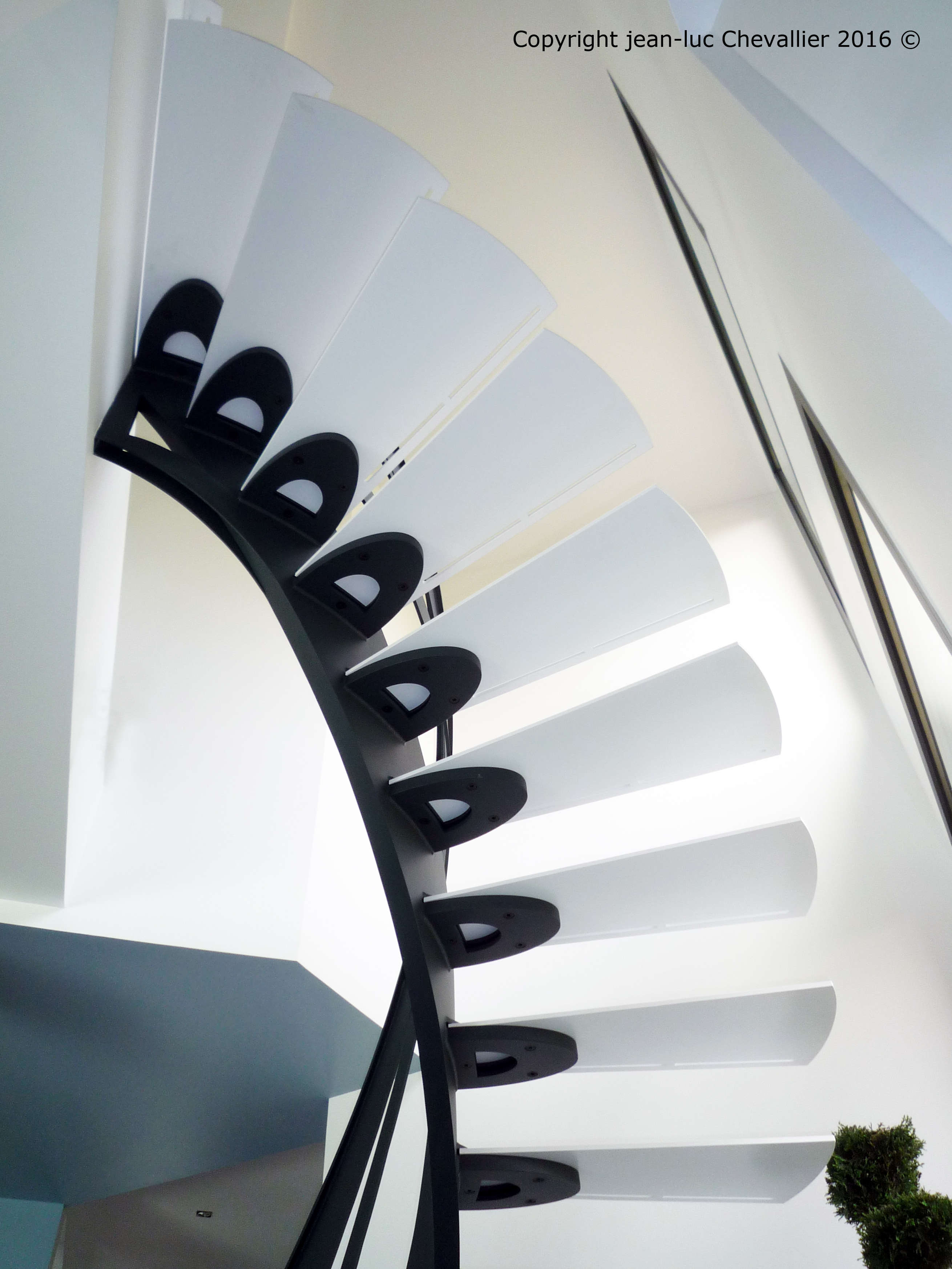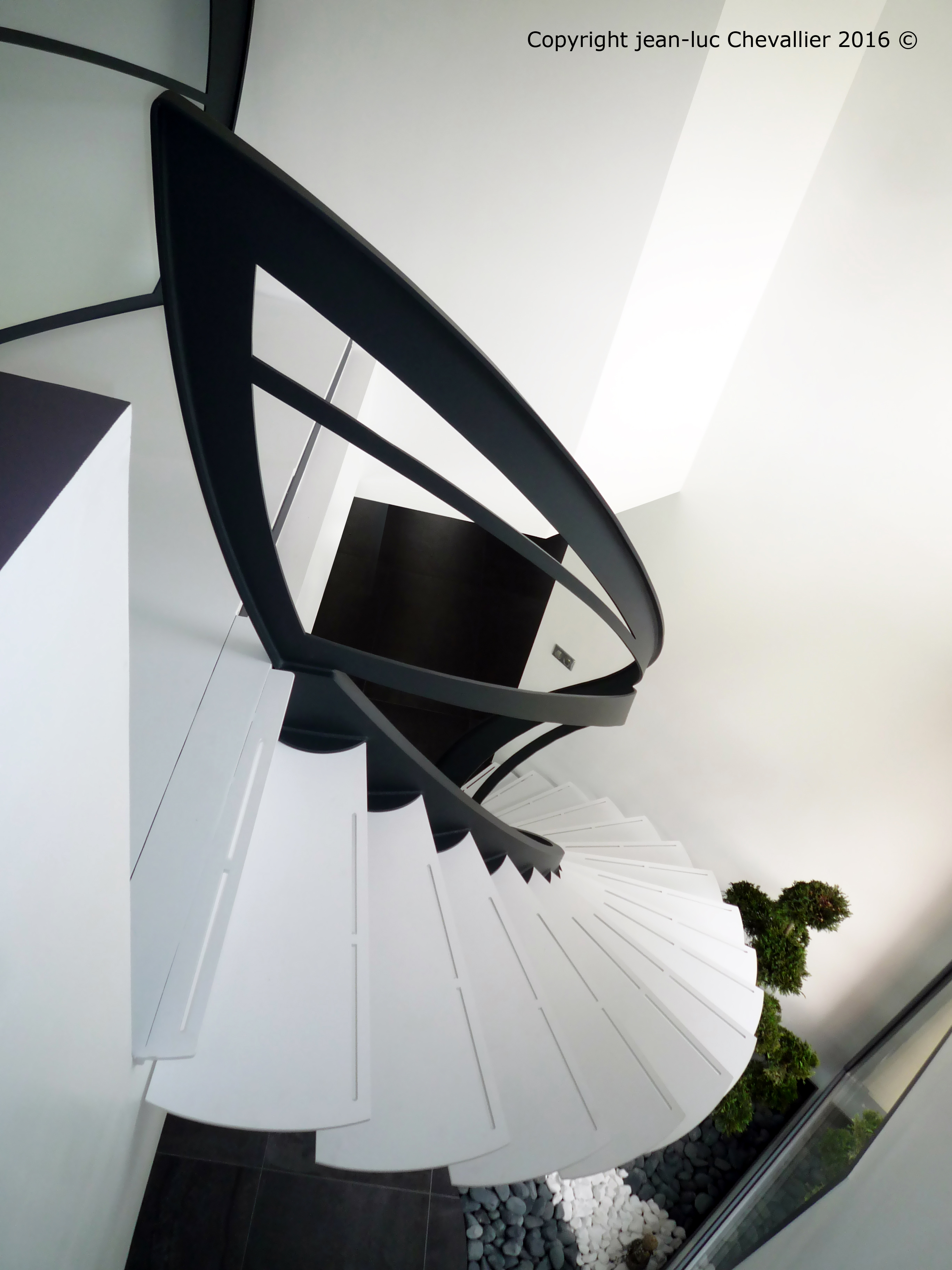 Le limon central arbore des marches suspendues et vient épouser avec délicatesse le garde corps rampant. Cette union formera le symbole infini, si cher à l’auteur.