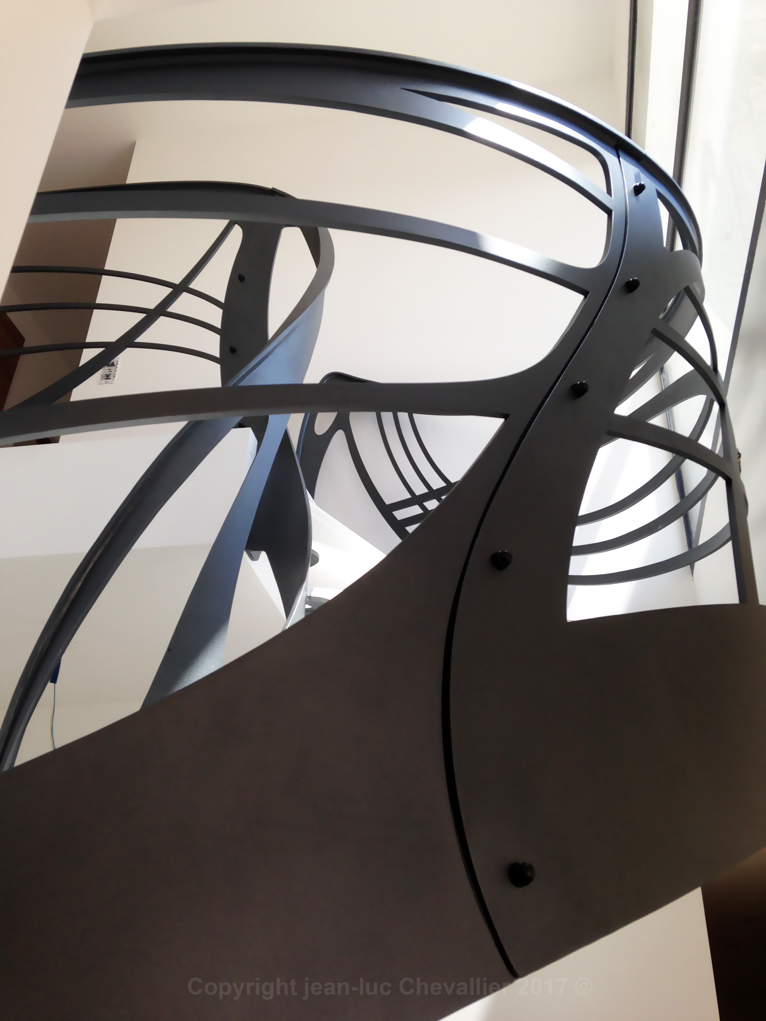Les courbes du limon aux structures fines des marches de l’escalier design se développent et enrobent les gardes corps sertis de lignes séduisantes.